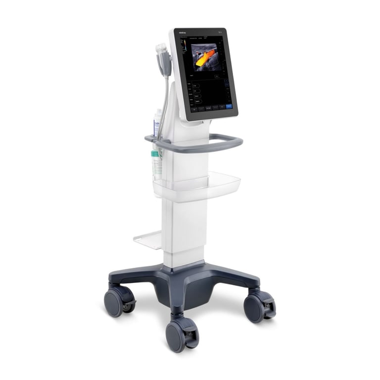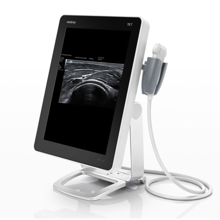 Mindray bezeichnet den TE5 offiziell als identisch mit dem TE7 in Bildgebung und Leistung. Der einzige Unterschied: Der TE5 ist ohne Sektorsonden-Anschluss und CW-Doppler — er ist bewusst auf Anästhesie, MSK und Regionalnervenblockaden spezialisiert. Wer keine bettseitige Echo braucht, bekommt dieselbe Qualität zu einem günstigeren Preis.