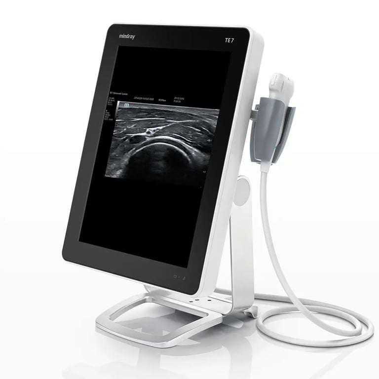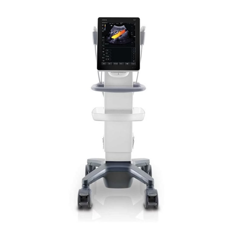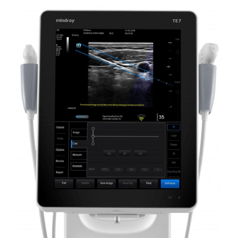 Die exklusiven Mindray-Schallkopftechnologien 3T (Triple-Layer, Total-Cut-Design, Thermische Überwachung), Single Crystal und ComboWave liefern eine Bildqualität die im POC-Segment einzigartig ist — besonders bei schwer schallbaren Patienten und bei hochfrequenten MSK/Nerven-Anwendungen bis 22 MHz.
